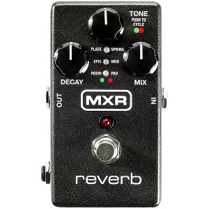 The MXR M300 digital reverb guitar effects pedal delivers six distinct high-end reverb styles, each exquisitely crafted and tuned by the award-winning MXR design team. It all comes in a standard-sized MXR box with a simple three-knob setup and a hi-fi analog dry path with a massive 20 volts of headroom thanks to Constant Headroom Technology. Each reverb style is as richly detailed as any found in the highest-end rack units and plug-ins, and all have to do to step through them is push the Tone knob.The PLATE setting provides a shimmering smooth wash of space that’s a go-to choice from the studio recording world. SPRING sets a new standard for truly authentic-sounding reverb without coiled metal—a perfect recreation of the classic amp-based effect, with the Tone control taking from dark vintage amp spring, through classic jangle, to bright surfy splatter. EPIC is a unique combination of multiple interwoven analog-tone delay lines and complex modulation—perfect for solos from that hidden part of the lunar landscape. MOD throws down a plate-flavored spaciousness with richly organic modulation in the feedback path. The ROOM style adds subtle body and projection to guitar tone at shorter decay times while longer decay times yield rich organic space that doesn’t wash out. PAD closes out the lineup with a unique combination of sub-octave + octave-up with echoes + "shimmer" + synth/organ modulation + reverb.Connect a Dunlop DVP series volume/expression pedal to the expression jack to toggle and blend between two different knob setting configurations. The Reverb includes 100% wet mode, stereo input and output capability, and true relay or trails bypass.