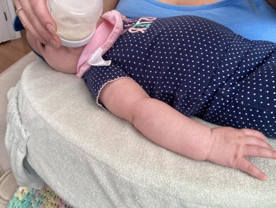 This feeding pillow is perfect for not only breathing feeding Mothers, but also for babies that are bottle fed. You wrap it around you and tighten it up as much as you need. It has the built in back support for the mother. You can comfortably lay your arm down while feeding the little ones. I love how it has a built on pocket to hold things. Making feedings go a lot smoother