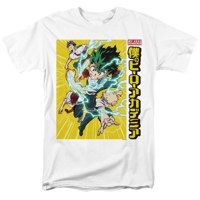 • Graphic Tee: Izuku Midoriya and Katkui duel each other in the design on this graphic tee. The characters wear their hero outfits and aim punches at their opponents. This tee makes a great gift for fans of the pair.