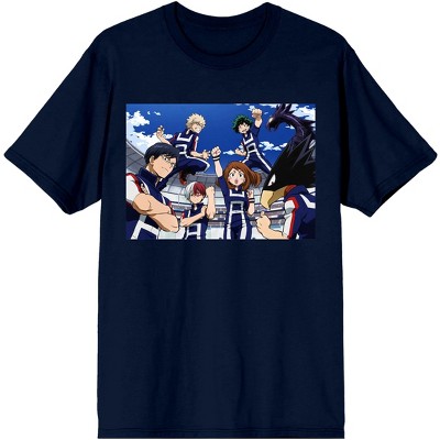 SHORT SLEEVE - The My Hero Academia character group men's navy t-shirt includes short sleeves for style and comfort in all sorts of weather.