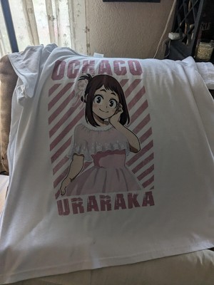 CUSTOM DESIGN: Ochaco Uraraka theatre dress, pink line bg on white tee. A fun and expressive graphic tee for any fan.