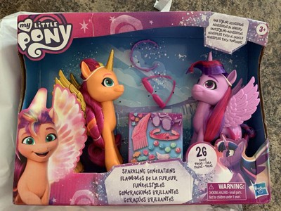 [This review was collected as part of a promotion.] My Little Pony: A New Generation Sparkling Generations is so adorable with Sunny Starscout and Twilight Sparkle . The ponies are sparkly and magical with wings and Unicorn horns . The box came with 26 pieces, 2 ponies that are 6 inch's and 24 fashion and hair play accessories, like a comb, clips, and sunglasses. The girls spent hours styling there long, soft, multicolor hair with the headbands and hair clips. I would definitely recommend for the My Little Pony fan.