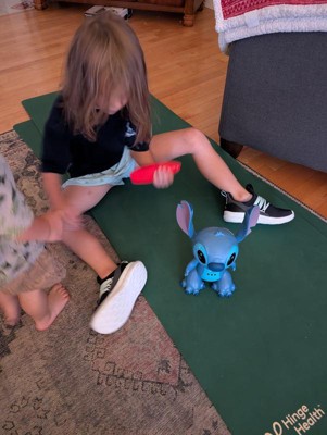 My kids have loved interacting with this remote controlled Stitch. The wheels glide easily over the wood floor and the low pile rug. They used the remote almost fully because the gesture mode would only cause Stitch to jabber. I tried it myself and pressed the gesture button and I was only able to get it to move backwards. The kids liked the story mode button the best where they can sit and listen to the narrator. I thought the robot was a nice size and the kids liked all of the sayings that Stitch can mimic.