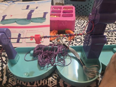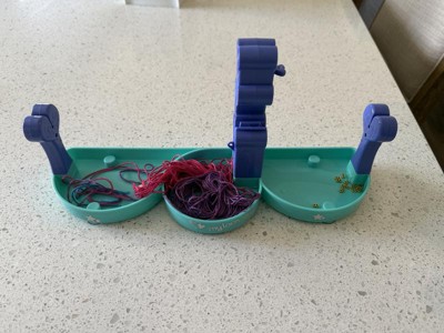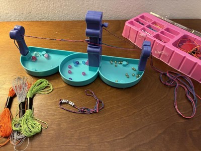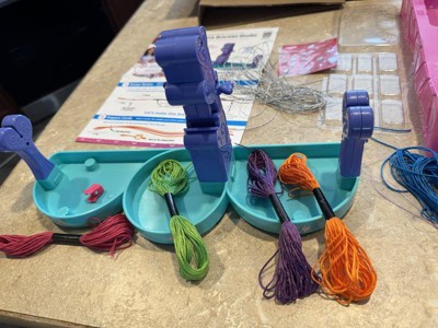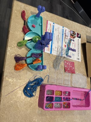 This bracelet making kit was fun but it is not for young kids. There is a lot more to it than just moving the center piece up and down. I would highly suggest using three colors so you can keep track of where you are moving the threads. It took us several attempts and still got "off" so the beads look wonky. Luckily my 7yo doesn't care but my 12yo would. I also dislike that once it is put together, it doesn't come apart for easy storage. It isn't super sturdy, so it really doesn't make sense to not make the column parts removable.