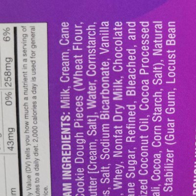 ice cream ingredients: milk, cream, cane sugar, cookie dough pieces (rice flour, powdered sugar, [sugar, ip-non-gmo corn starch], butter [cream, salt], sugar, water, molasses, salt, sodium bicarbonate, vanilla extract), whey, nonfat dry milk, chocolate bits (cane sugar, refined, bleached, and deodorized coconut oil, cocoa processed with alkali, cocoa, corn starch, salt), natural flavors, stabilizer (guar gum, locust bean gum), mochi dough ingredients: cane sugar, water, sweet rice flour, egg whites, cornstarch, enzyme, caramel color' '