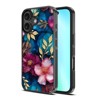 A: The case features elegant floral artwork with radiant gold-accented petals on a sophisticated background.