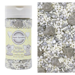 White Elephant Sprinkle Mix from Mystic Sprinkles are just what you need to take all of your treats to the next level! This 3.7oz bottle contains an adorable combination of elephant shapes, white pearls, silver quins and white jimmies, ready to top cookies, cupcakes, brownies, ice cream and more!