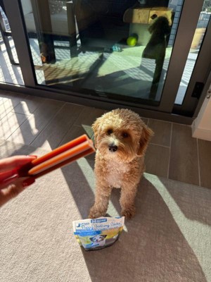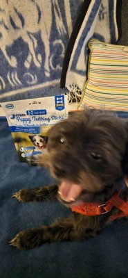 [This review was collected as part of a promotion.] These are actually perfect for my little dog, he isn’t a puppy but because he’s a yorkipoo he needs something either made for small dogs or puppies. These are great for his smelly breath and they help to clean his teeth! In a pinch if I run out for my big dog!