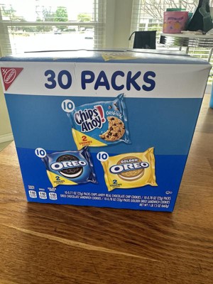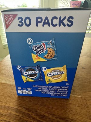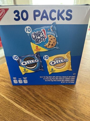 - One Nabisco Sweet Treats Cookie Variety Pack with 30 two-cookie snack packs, including 10 each of OREO Original, OREO Golden and CHIPS AHOY! (packaging may vary)