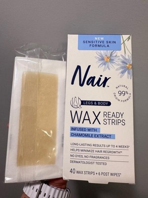 Keep glowing with Nair Sensitive Hair Remover Wax Ready Strips for Legs and Body, with chamomile extract. These dermatologist-tested wax strips leave your skin smooth as they effectively remove hair from the root. Perfect for areas like legs, arms and underarms. This hair removal waxing kit helps minimize hair regrowth with repeated use as directed, and lasts up to 4 weeks (individual results may vary). No rubbing, or warming required. Simply peel to separate strip, press firmly onto the area, hold skin taut, pull quickly in the opposite direction of hair growth, and use the non-flushable post wipes to soothe skin and remove residue. Always patch test a small area 24 hours before use (see insert instructions). Award winning Nair has always been a trusted leader in hair removal. Worship yourself with Nair.
