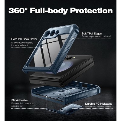 CASE KICKSTAND: Back of the case features built-in kickstand. Unsnap the hinge then slide downward until the kickstand snaps into place. Now you can prop your phone in different positions at your desk. Horizontal - This is ideal for watching movies and videos. Vertical - This is a handy prop for those "face-to-face" handsfree video calls.