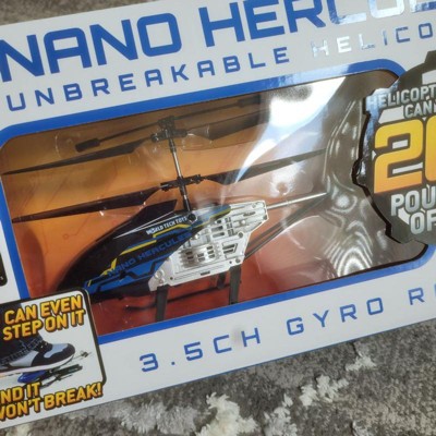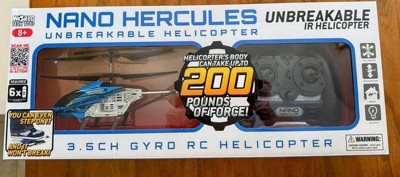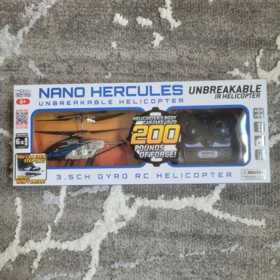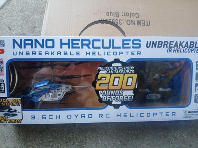 Introducing the GYRO Nano Hercules 3.5CH Electric RTF RC Helicopter! The Nano Hercules Body can hold someone stepping on it! This RC helicopter has super strong polymer frame which lets it hold up to 200 pounds of force! This awesome Helicopter comes with the greatest advancement in Helicopter Technology, a Gyro! No more crashing, no more replacing parts, the GYRO has changed the Helicopter industry completely, making this RC Helicopter super easy to fly. Great for people of all skill levels, this bad boy features a coaxial rotor a single rear rotor for precise movement and a GYRO for increased stability whether flying or hovering. Controlling the Hercules is a breeze. It can go forward, backward, up, down, left, right and hover. What really makes the GYRO Hercules stand out is the built in gyroscope making it automatically stabilize allowing you to focus on flying instead of trying not to make it crash. This product is ready to fly, there is no assembly required. Just put in 6 AA batteries into the transmitter and charge the helicopter's rechargeable battery with the integrated charging cable on the transmitter or use the included USB Port Charger and you are good to go! Be the coolest kid on the block by getting the GYRO Nano Hercules 3.5CH Electric RTF RC Helicopter.