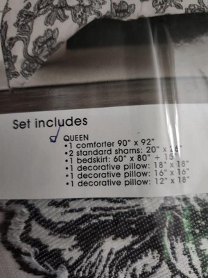 Includes: Bed Skirt, 2 Shams, Comforter, 3 Decorative Pillows