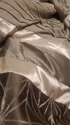 [This review was collected as part of a promotion.] I am in love with my Trinity comforter set!! I was literally looking for a modern set in these colors and almost gave up before finding the Trinity set. My set came with a comforter, 3 decorative pillows and 2 pillow shams but no bed skirt, which I was ok with since a bed skirt wouldn’t work for my bed type. The color a bit lighter than pictured and would’ve liked a bit darker tunes like the ones in picture. The material seems to be decent and more on the lighter side so I won’t use it during cold weather unless I am layering on top of heavier blankets. The stitches are ok and hope they will be durable with use as I noticed some loose threads here and there. Not sure it will be ok to wash it in a washer if it gets dirty. It is a pretty and elegant looking set but quality is ok in my opinion.