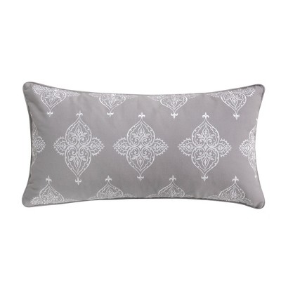 The Fish decorative pillow matches perfectly with the Levtex Home Freeport bedding collection. This pillow is sized at 12x24in. and features delicately detailed fish embroidered in silver thread on a grey & white classic natural canvas ground. The soothing, coastal color palette makes this a versatile accessory for your bed, couch or favorite chair. The pillow comes pre-filled with a luxurious feather inner.