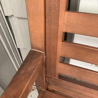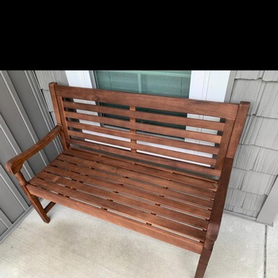 This bench is great, especially for the price. A few of the joints are not stained well and the color is a bit uneven, but it doesn’t bother me. Pretty easy to put together, but would be very easy with 2 people. Overall, great for the price.