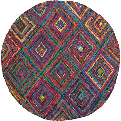 The round shape of this rug is designed to create an inviting atmosphere, making it an ideal centerpiece for your living area, bedroom, or reading corner. With its mesmerizing pattern of concentric diamonds and a riot of colors, the rug captures a spirited style that can blend seamlessly with both contemporary and traditional decor themes.