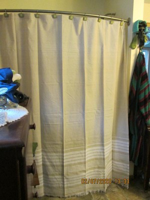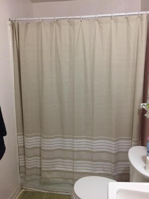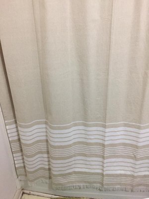 [This review was collected as part of a promotion.] Upgrading your bathroom is easy with this natural light burlap color dyed-yarn shower curtain. The cut is even, with seams and shower hook slits that are smooth and securely sewn. Whether you enjoy a farmhouse, beach, casual, or classic elegant look, it blends with any color fixtures and accessories, and the muted stripes and short fringe add a fashion touch. We have a curved shower rod, and it is light enough to push aside easily while climbing in and out of the tub and heavy enough to hang smoothly. Because this shower curtain is crafted of 100% cotton material, it is very important to follow the cleaning instructions, which clearly state that it is to be machine washed in COLD water and hung to dry. I'm delighted with the quality and "go with" versatility.