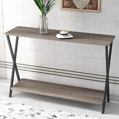This narrow side table features reinforced iron legs with a single-tier weight capacity of 50 pounds, ensuring stability and durability. Its slim profile fits perfectly in compact spaces like entryways, behind sofas, or hallways, serving multiple functions such as key and mail storage or lamp placement. Its neutral modern farmhouse aesthetic effortlessly complements industrial, Scandinavian, and other home styles. Pre-drilled components with illustrated assembly instructions ensure quick setup for immediate use, making it an efficient storage solution for compact living spaces.