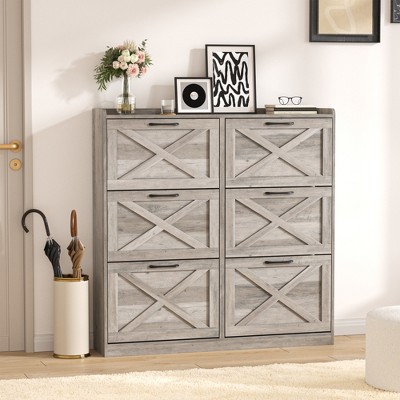 - Large Capacity Farmhouse Shoe Cabinet: The entryway shoe storage has two upper, each drawer contains two layers of storage space. The panel can be adjusted or removed in two grooves to accommodate different heights and sizes of shoes. The shoe cabinet top and bottom also provide additional space to accommodate items, this pretty much caters to the family.