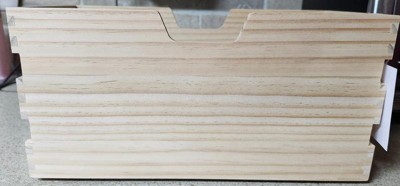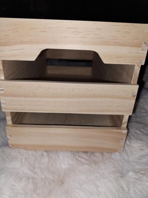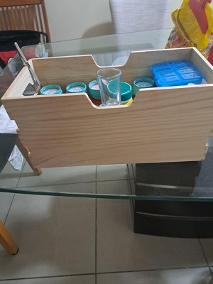 This narrow light weight wooden bin can be painted or stained whatever your preference. This bin is made of pine wood and measures 12.75 inches long and 6.25 inches wide. I am using it in my kitchen drawer to hold different sizes of my storage food bags.