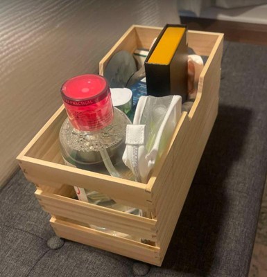 I selected the open-top Narrow Wood Bin by Brightroom to store and organize my beauty supplies under the sink. This lightweight bin features a natural wood design with slats and cutout handles for easy carrying.