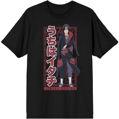 • GRAPHIC TEE: Itachi Uchiha, Sasuke's big brother, dons a balck kimono with red patches as red kanji letters appear next to him. This graphic tee makes a great gift for fans of the Naruto Shippuden anime series.
