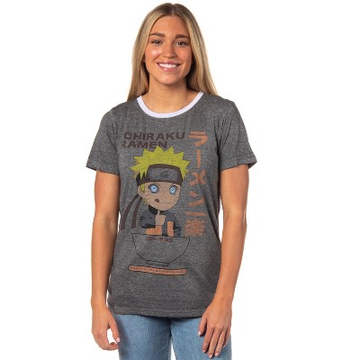 CUSTOM DESIGN: A chibi image of Naruto holding a bowl of Ichiraku Ramen decorates the front of this graphic tee while orange kanji letters appear next to the character. Naruto Shippuden fans will love this fun design.