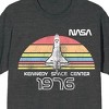 Take your style out of this world with this NASA tee. The shirt features an image of a spaceship in a colorful semi circle while white text below the image reads, "Kennedy Space Center, 1976." The NASA logo appears in white above the image. The tee comes in an anthra melange short sleeve crew neck. Fans of the space exploration agency will love this comfy t-shirt.