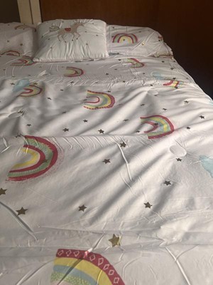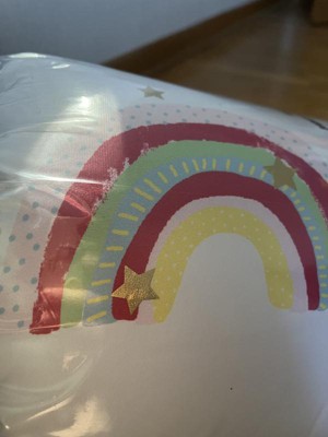 - Decorate your kid's first bedding in rainbows and metallic print stars motif