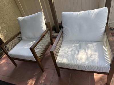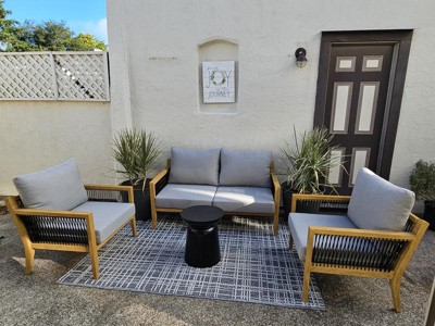 The set is beautiful and sturdy, and the cushions are high quality. I’m worried about the longevity of the acacia wood. It seems like it may age easily outdoors and I’m considering the need to add a top coat.