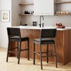• This black faux leather bar height stool highlights a woven leather back rest with beautiful stud details.