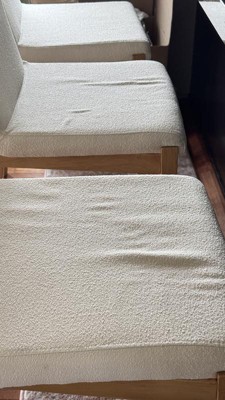 The chairs look very nice. But the seat covering material seems to be like a Terry cloth as it leaves ripples after sitting in it and it doesn’t seem like it might last very long. Also likely subject to staining. I would have preferred an I would have preferred a sturdier material that was stain resistant. Also, the four legs don’t equally stand on the floor unless it’s being sit in.