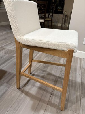 I purchased 4 Wood Boucle Counter Height Bar Stool Warm Pine. They were extemely easy to assemble. The quality of the seat, hardware and wood is exceptional. I like that they are not bulky because I have a small space. The seats were very firm and comfortable to sit in. I love that it has enough back support without being a full back. The stools also have real nice chair leg pegs on the bottom so it doesn't scratch the floor but easy to push around for my kids to get on and off.