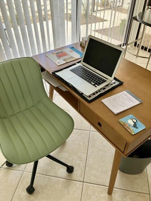 Looks good, love the mid century vibe. The small drawer is handy, and I love being able to store my paperwork on the shelf.