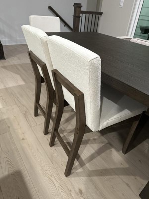 - Gracie features a brushed dark brown wash on its solid legs and cream boucle upholstery, making it a suitable addition to your scandinavian style kitchen.