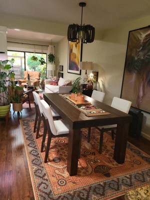 I really like these chairs, they look great with our dark wood dining table. Transitional style, elegant, and not over the top.