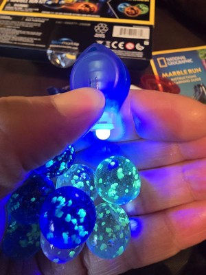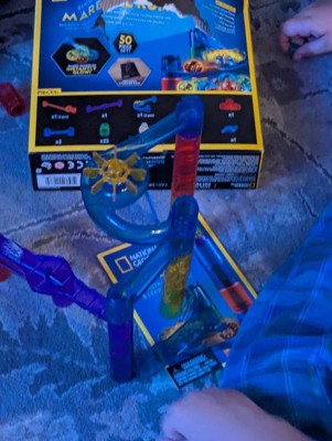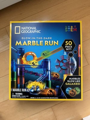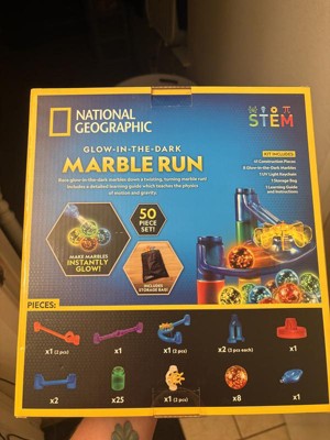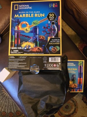 The National Geographic Glow in the Dark Marble Run is a really engaging toy that blends the fun of a classic marble run with a cool, glowing twist. The kit comes with a UV light keychain to "charge" the marbles, and watching them zip down the tracks in a darkened room is genuinely a highlight. It's a fantastic way to introduce kids to concepts of gravity, engineering, and problem-solving, as they learn through trial and error how to build stable and effective tracks. Assembly is fairly intuitive, and the pieces fit together snugly, which is a big plus for preventing frustrating collapses. The set also comes with a convenient storage bag, making cleanup easy. However, be aware that the 50-piece set is quite small. The number of pieces can be misleading, as marbles and other small accessories are included in the count. To build more complex and exciting runs, you will likely need to purchase additional sets. The instruction manual also lacks detailed build examples, so it relies heavily on a child's imagination or a parent's help. Overall, it's a solid educational toy, but the real fun starts when you combine it with another set for a much bigger, more intricate creation.