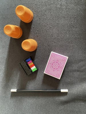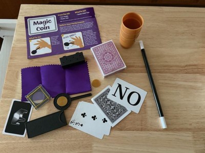 - Kit includes coin case, crystal coin case, puzzle card, cups and ball set, clubs, magicians deck, double sided card, magic wand and more!