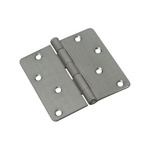 National Hardware Hinge is ideal for all residential doors. Residential door hinges steel 1/4 inch radius round corners 4 inch satin nickel. Made of heavy-gauge cold-rolled steel for added strength. Five knuckle, full mortise design. The 8 screw holes are countersunk. Includes a removable pin for easier installation. Poly bagged with screws. (1) hinge.