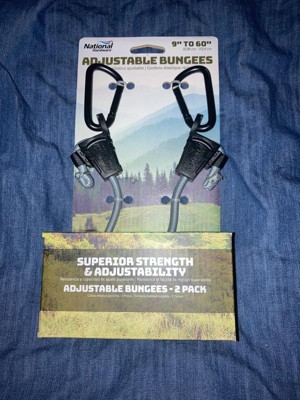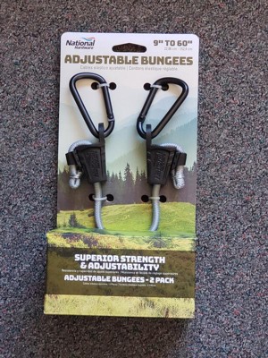 [This review was collected as part of a promotion.] National Hardware Adjustable Bungees, 9" to 60". A very fancy form of open end rubber band. I need bungee cords to hold various items when I over stack the garden wagon (recycle cardboard, long flower stocks/weeds) or to hold tools down (rake, shovel, etc). This style was a 2-pack, which is perfect, I can use one for each direction on the wagon. The adjustability is a great feature to adapt the cord for each project/need.