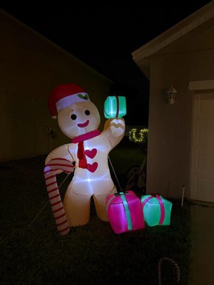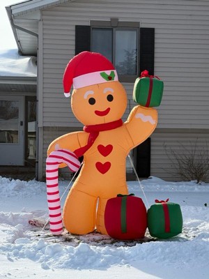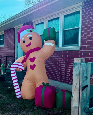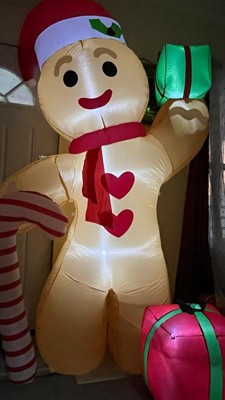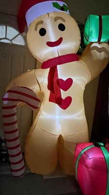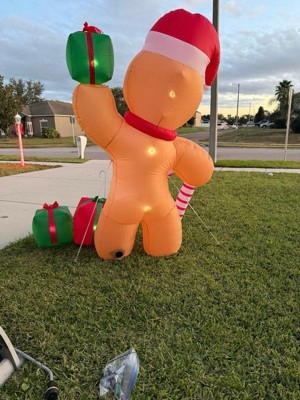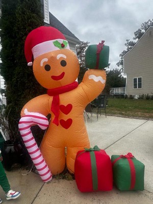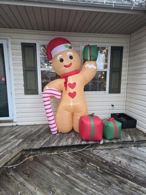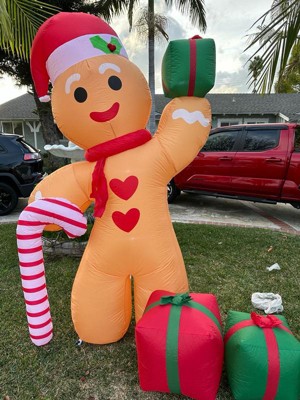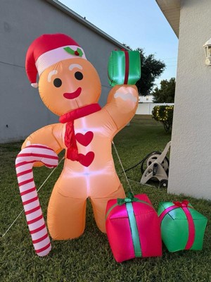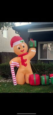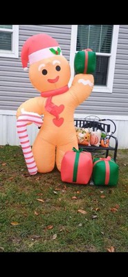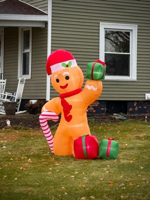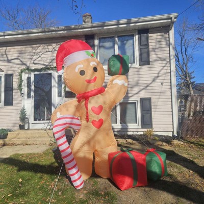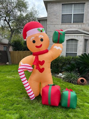 - This fantastically festive lawn inflatable features a larger than life gingerbread man wearing a Santa hat and holding a candy cane and presents