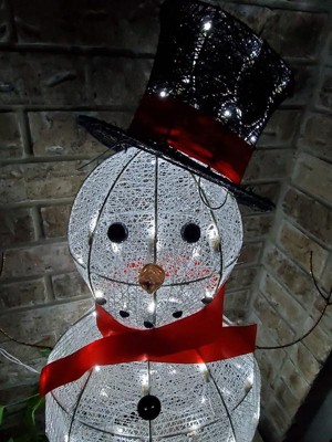 [This review was collected as part of a promotion.] Gorgeous festive twinkling 36" tall wire frame snowman pre-lit with 70 cool white led lights. It is so cute at my front door as it greets everyone who enters or walks past. It is the perfect addition to everyone's holiday decorations. I love all the attention to detail on the snowman from his buttons to his carrot nose and glittering twig arms. The black top hat fits perfectly however I decided to give it a little tilt for my guest. It is very easy and only took a couple of minutes to put together, however you will need to purchase the cable ties. It definitely lights the way on a chilly night and will bring Snowman smiles to your home. Simply plug in. I recommend this product for added light magic to your holiday.