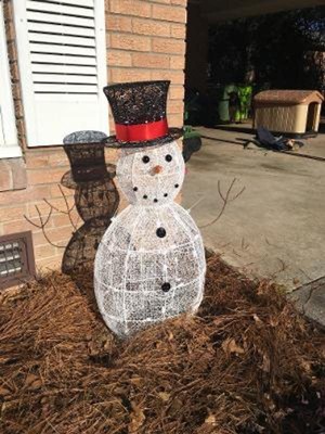 Snowman is very pretty and my neighbors enjoyed but quality seems to be lacking. Arm broke, the welded piece to attach arm to body broke off. Tried to zip tie arm on but zip tie is not holding. Very disappointed, as this is not meant to last a season.