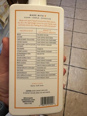 A: The lotion contains plant-based moisturizers, niacinamide, sugar, lemon, coconut, and creamy vanilla.