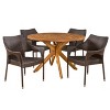 It's not just about the food. It's about the experience. With a charming slat panel tabletop and lovely wicker seating, our five-piece dining set combines function and style to create the perfect outdoor lounge area. Featuring stackable chairs and a rich round acacia wood table with a cross base, this set is made for impressive luxury and offers enough space for even the most extravagant meal.