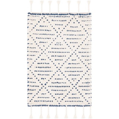 Introduce a touch of elegance and craftsmanship into your home with our exquisite Hand-Loomed Ivory and Blue Wool-Cotton Blend Area Rug. Sized perfectly at 3 feet by 5 feet to harmonize with any space, this small rectangle rug showcases an intricate geometric pattern, embodying sophistication and timeless style.