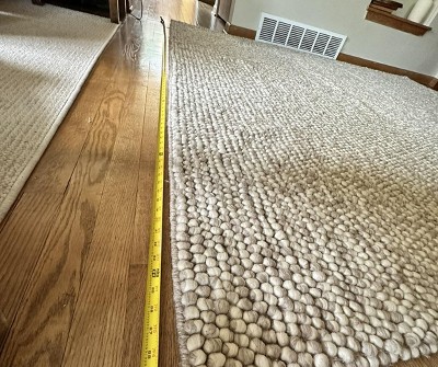 Really soft and comfortable rug. I bought the silver and it really does look silver without being metallic. Just clears the bottom of my door, but you may want to check that if you think it might be an issue.