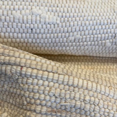 described as natural, they're mostly white with beige warp and natural hemp-look edgings described as 13", are actually 15" described as 100% cotton, labeled "recycled fibers of indeterminate origin"...I'm pretty sure they're cotton or poly-cotton, they feel like heavy t-shirt material. I don't mind helping the environment but I don't want to pay for new and get recycled, you know? This kind of mislabeling is really very bad and why I'm marking them not recommended. It's not worth the hassle of returning, they're good enough for my purposes, but be aware that you may not get what you're expecting.