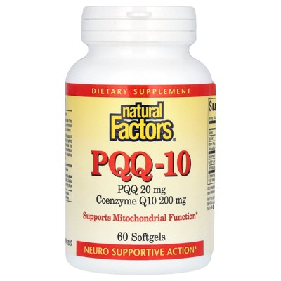 Dietary Supplement PQQ 20 mg, CoQ10 200 mg Supports Mitochondrial Function Neuro Supportive Action PQQ, considered a novel cofactor with antioxidant and B vitamin-like activity, supports mitochondrial function. PQQ and CoQ10 work together to promote antioxidant activity and mitochondrial health, providing multifunctional support for cardiovascular and neuro health. BioPQQ is manufactured in Japan using a patented fermentation process. Natural Factors CoQ10 is also produced through fermentation, consisting only of the natural form trans isomer identical to the body's own CoQ10. Isura™: Non-GMO: Documentation ✔ Mass Spec: Lab Tested ✔